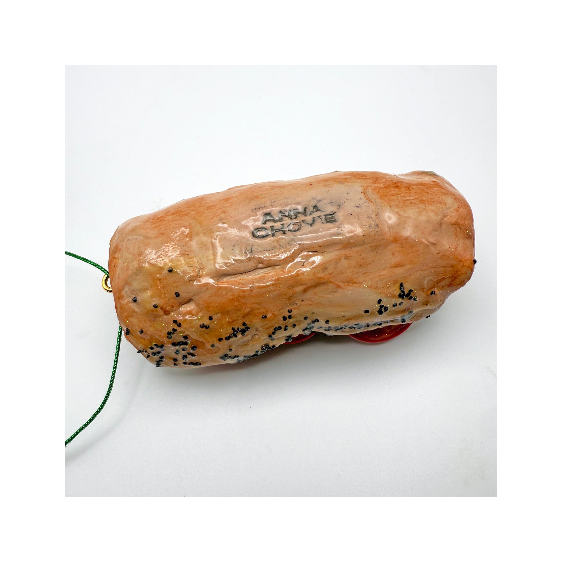 Handmade polymer clay Chicago Dog ornament. All about the details -- poppy seed bun & topped with mustard, green relish, tomato slices, pickle, and sport peppers.