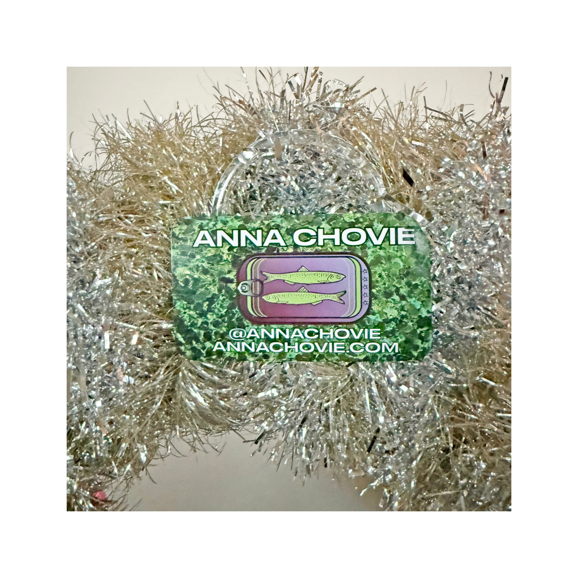 This one-of-a-kind wreath showcases handmade deviled eggs and garnishes arranged with festive faux fauna on a two-toned silver tinsel base.