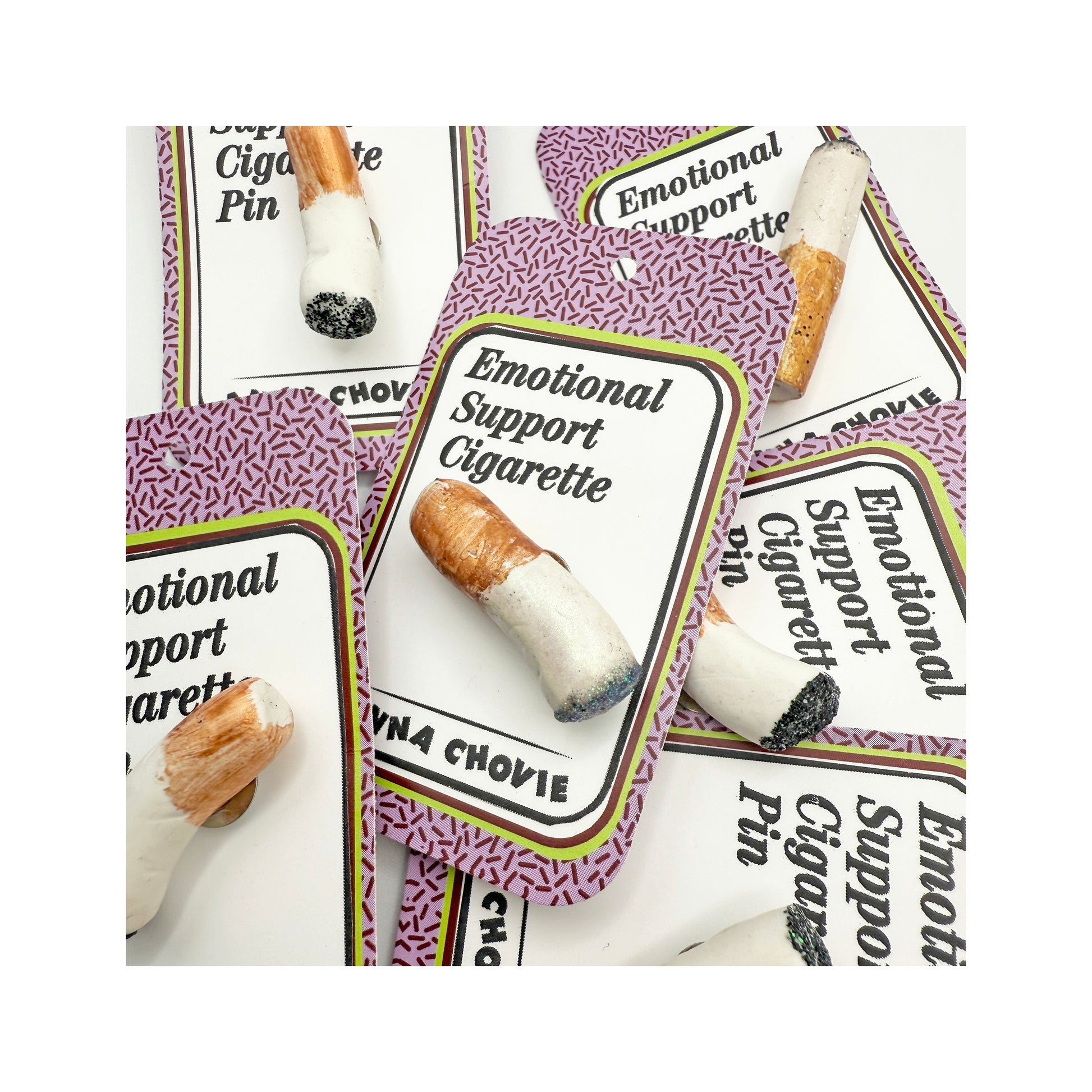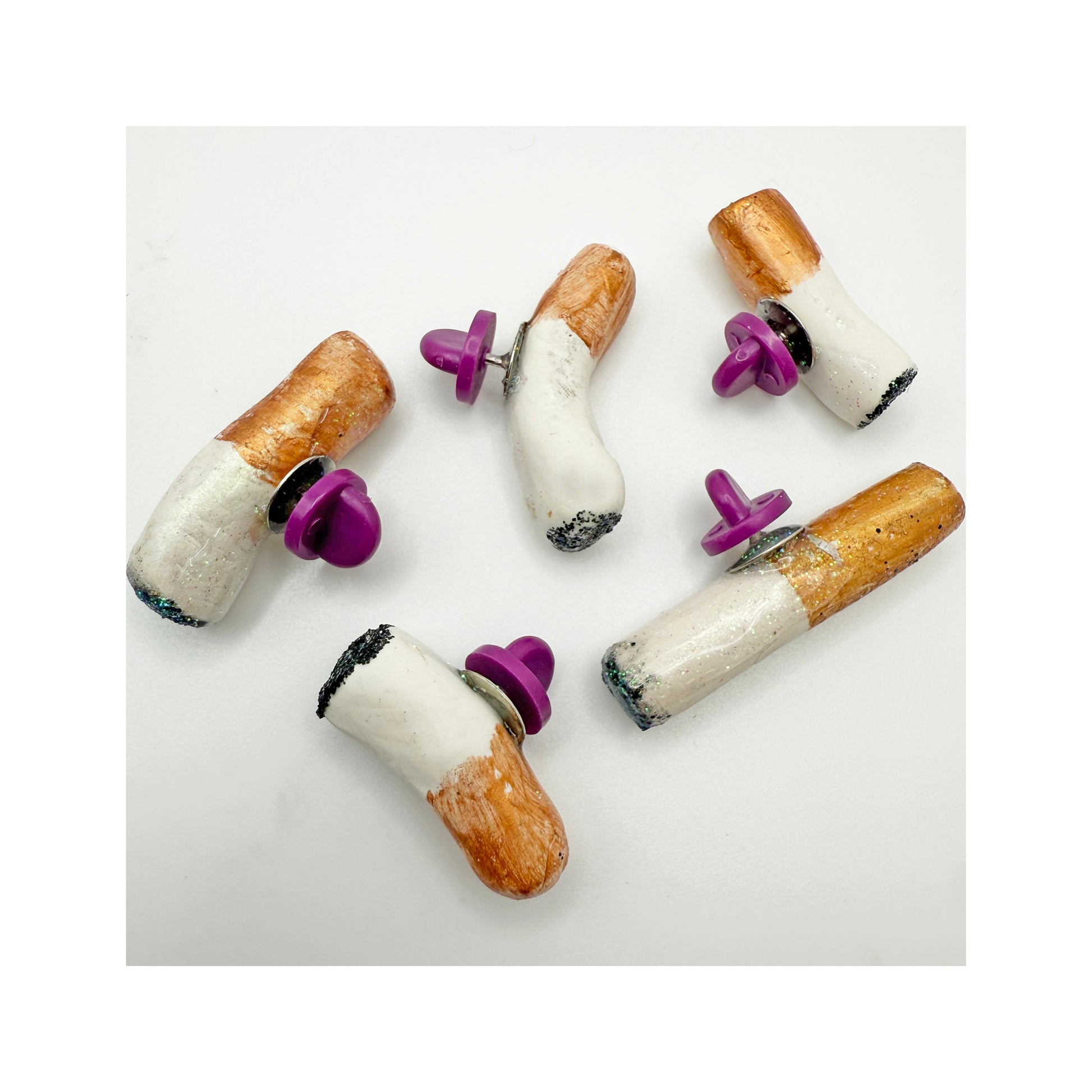 One handmade polymer clay cigarette butt with glittery resin ash. Tie tack pin style backing.