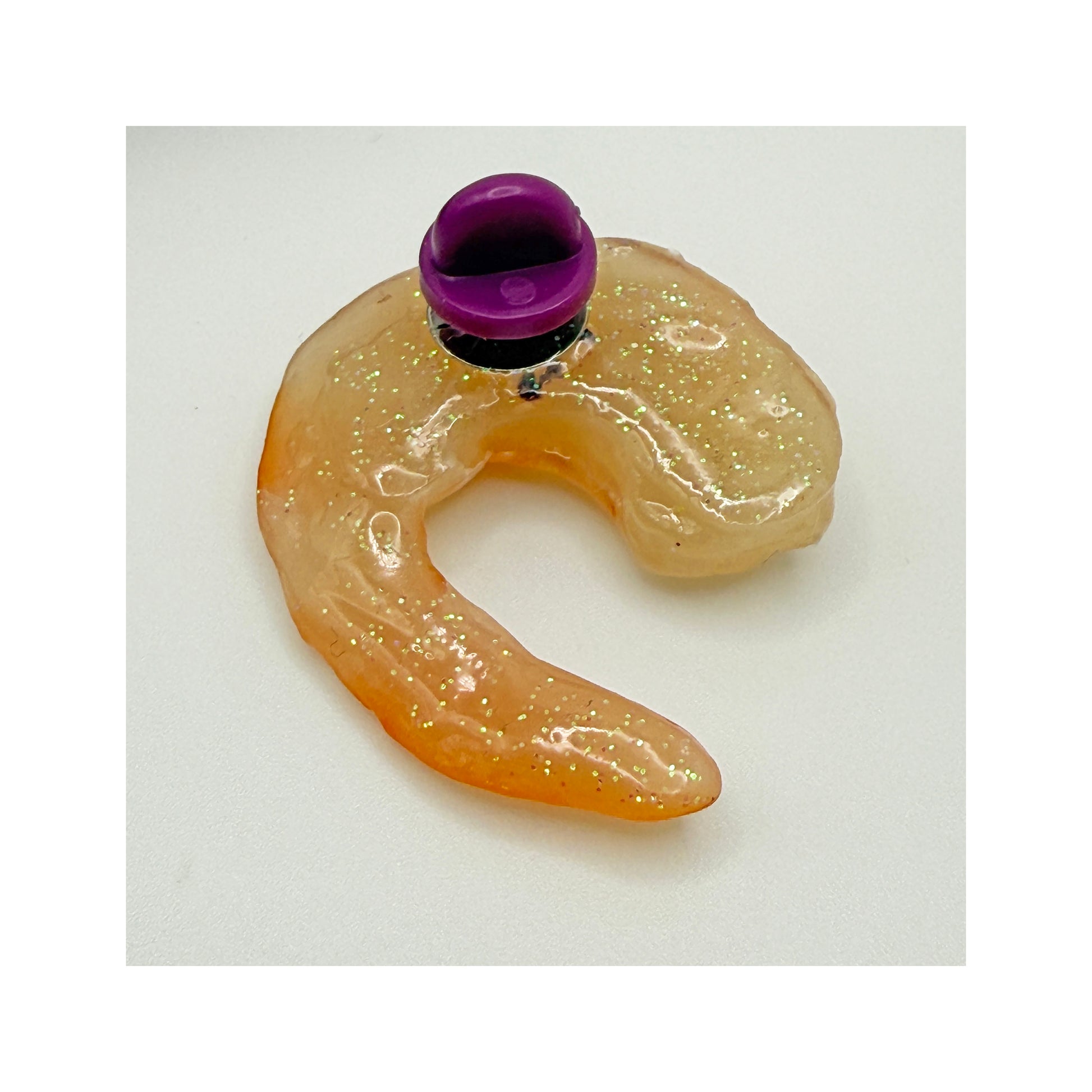 One handmade cocktail-style polymer clay shrimp with resin coating. Tie tack pin style backing.